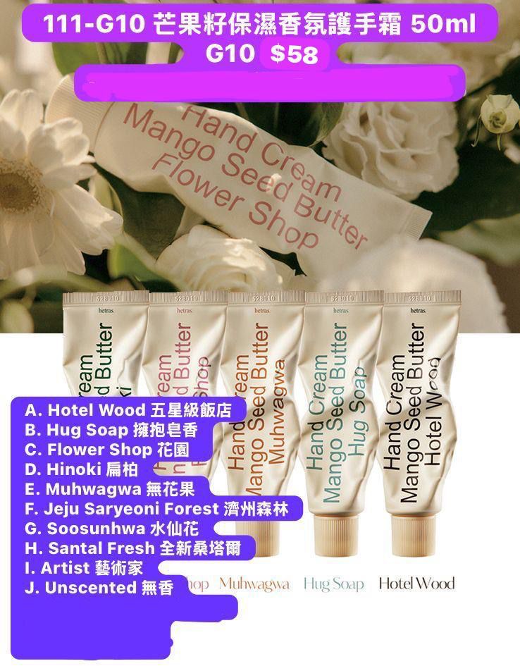 這款芒果籽保濕香氛護手霜,容量為50ml,提供多種迷人香氣,讓您在滋潤雙手的同時,享受愉悅的香氛體驗。這款護手霜富含芒果籽油,能深層滋潤乾燥的雙手,使肌膚柔嫩光滑。質地輕盈不黏膩,能迅速被肌膚吸收,帶來舒適的使用感。無論是日常保養或隨身攜帶,都是您呵護雙手的理想選擇。 這款護手霜適合各種膚質,特別是乾燥和需要滋潤的肌膚。其保濕配方能有效舒緩乾燥引起的不適,使雙手恢復柔嫩彈性。多種香氛選擇,滿足不同喜好,讓您隨時隨地散發迷人魅力。 產品特色: * 富含芒果籽油,深層滋潤肌膚 * 質地輕盈不黏膩,迅速吸收 * 多種香氛選擇,滿足不同喜好 * 50ml容量,方便攜帶 * 適合各種膚質,特別是乾燥肌膚 * 有效舒緩乾燥引起的不適 * 使雙手恢復柔嫩彈性 香味選擇: * Hotel Wood 五星級飯店 * Hug Soap 擁抱皂香 * Flower Shop 花園 * Hinoki 扁柏 * Muhwagwa 無花果 * Jeju Saryeoni Forest 濟州森林 * Soosunhwa 水仙花 * Santal Fresh 全新桑塔爾 * Artist 藝術家 * Unscented 無香