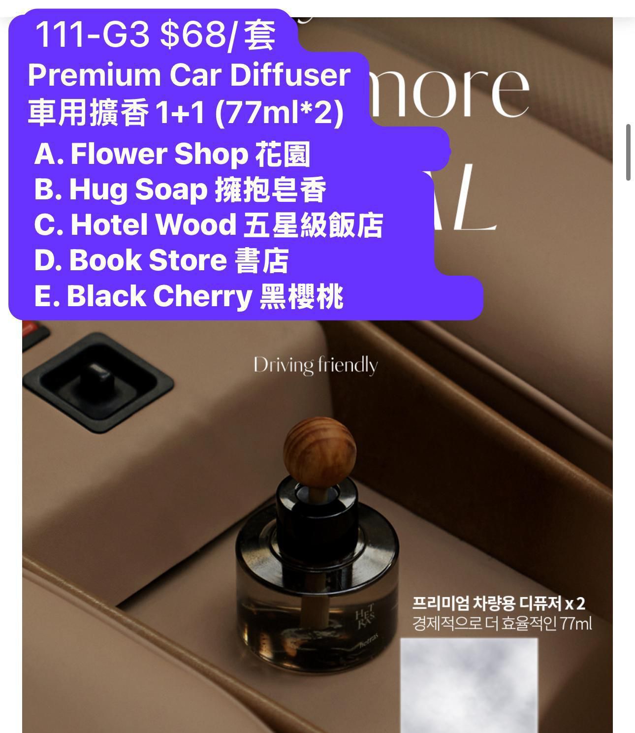 A. Flower Shop 花園:彷彿置身於花園中,清新自然。 B. Hug Soap 擁抱皂香:溫和舒適,給人以安心的感覺。 C. Hotel Wood 五星級飯店:奢華典雅,營造高級氛圍。 D. Book Store 書店:充滿書香氣息,適合文藝愛好者。 E. Black Cherry 黑櫻桃:甜美誘人,帶來活力。 產品特點: * 高級汽車香薰,提升車內空氣質量 * 1+1套裝,總容量77ml*2,持久耐用 * 多種香味選擇,滿足不同喜好 * 設計簡約時尚,易於安裝 * 適合注重生活品質的車主 * 是駕駛友好的產品 * 經濟實惠的77ml容量