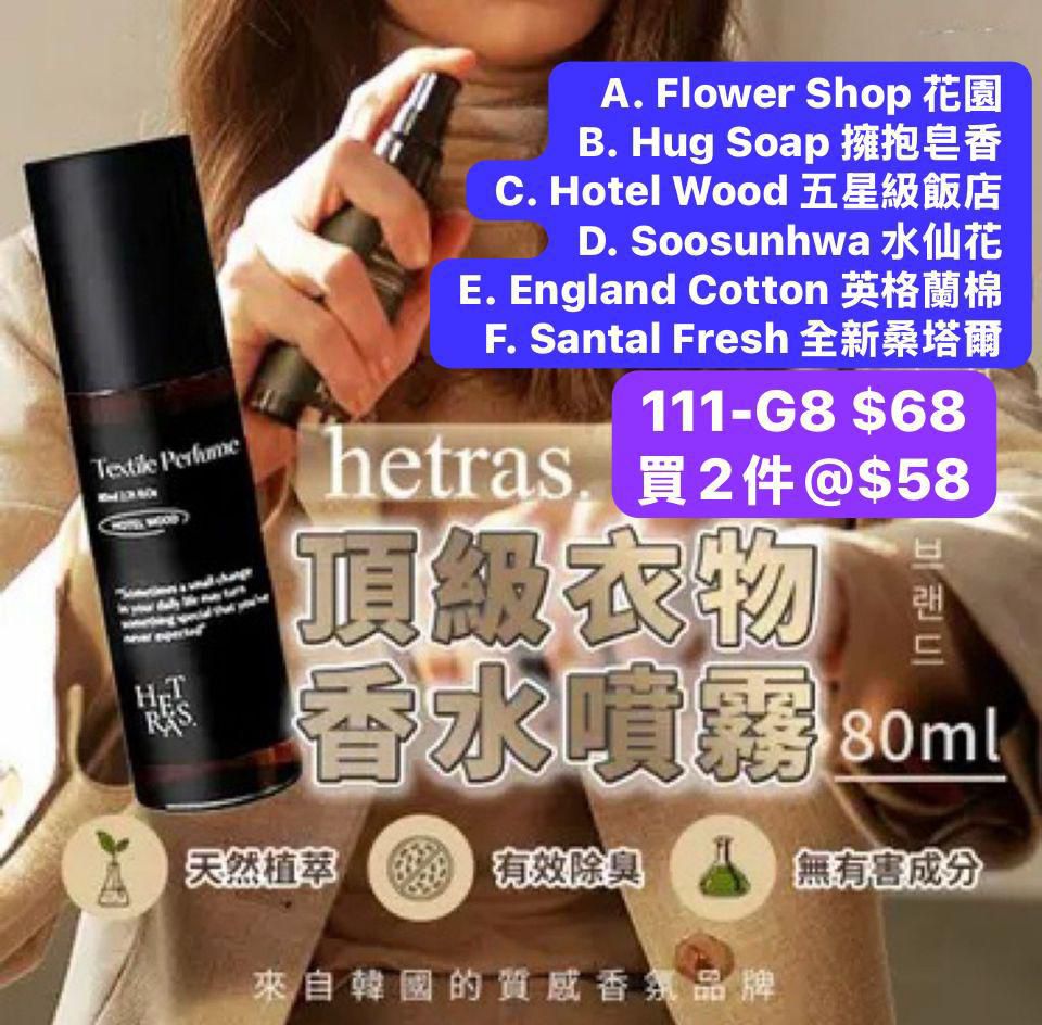 Hetras 頂級衣物香水噴霧共有六種獨特香氛可供選擇,每一種都經過精心調配,帶來不同的感官體驗: A. Flower Shop 花園 B. Hug Soap 擁抱皂香 C. Hotel Wood 五星級飯店 D. Soosunhwa 水仙花 E. England Cotton 英格蘭棉 F. Santal Fresh 全新桑塔爾 產品容量為80ml,輕巧便攜,方便您隨時隨地為衣物增添香氣。此外,HETRAS 頂級衣物香水噴霧採用天然植物萃取成分,無有害成分,安全可靠,讓您安心使用。 主要特點: * 六種獨特香氛選擇,滿足不同喜好 * 有效去除異味,保持衣物清新 * 採用天然植物萃取成分,安全無害 * 80ml容量,輕巧便攜 * 為衣物增添奢華質感